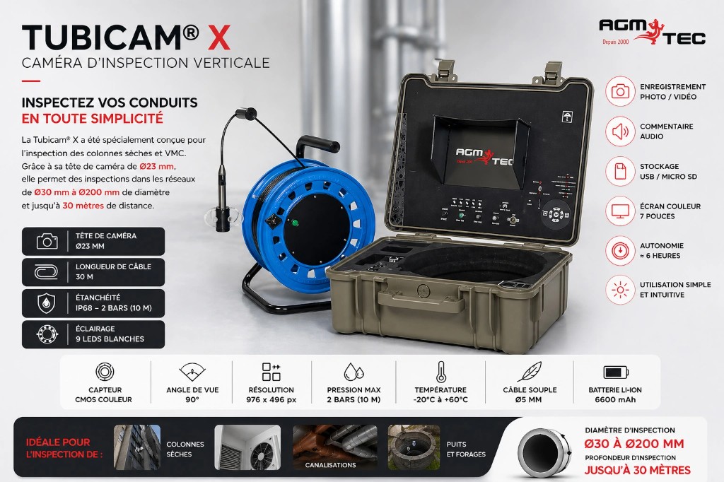 La Tubicam X est conçue pour l’inspection de conduits verticaux et de réseaux de petit diamètre. Son objectif est simple : vous permettre de visualiser l’état réel d’un réseau sans intervention destructive, pour décider plus vite et intervenir plus précisément.